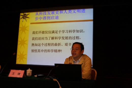 王健老师带领大家熟悉了科学史的发展过程,接着评析了全国创新大赛工程组的一些参赛案例,指导大家进行科技创新和科学辅导,内容具体生动;刘新会教授具体细致地讲述了在科学研究中如何选题、写开题报告和科技论文的写作要求,深入浅出,操作性强;朱元杰老师对科学DV的选材、制作等方面进行详细地解说和指导,让人耳目一新;李秀菊老师作了《非正规科学教育的理论和实践》的专题报告,对非正规教育进行了深刻解读。四位老师的课生动详实,有理有据,吸引着在场的科技辅导员,互动环节他们频频发问,获益匪浅。