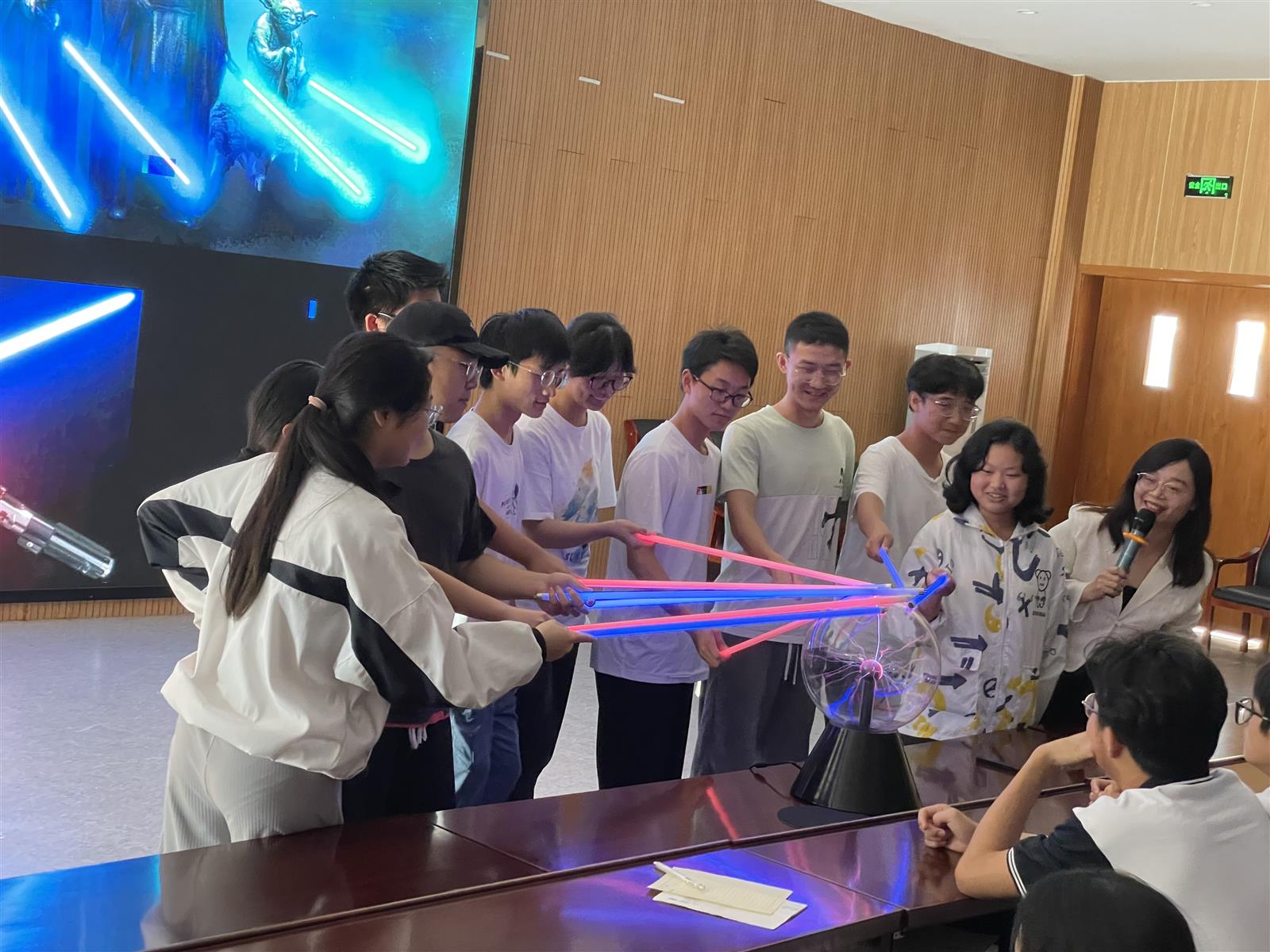 张素贞博士通过图文并茂的方式从“什么是人造太阳”到“人造太阳的作用”,再到“人造太阳的未来”,娓娓向同学们揭开“人造太阳”的“神秘面纱”,科普核聚变能源相关知识。为了加深同学们对于“人造太阳”的理解,张博士还特地带来了有趣的实验道具,并邀请孩子们上台一起互动体验,当炫酷的“等离子光剑”在他们手上亮起来的时候,现场响起了一阵又一阵的惊叹和掌声。