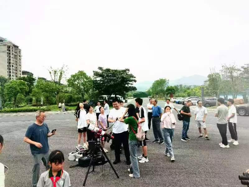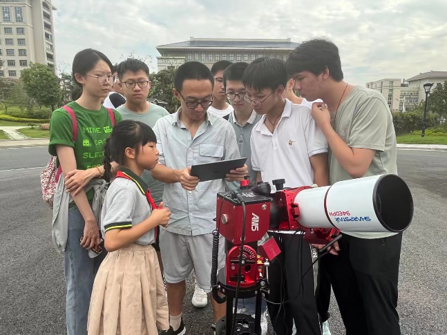 15日上午全体营员、带队老师、志愿者、各高校参与人员乘坐大巴前往东至县与东至气象局工作人员会合。下午刘浩教授与安庆师范大学梁智雄老师分别作了题为“在大大的宇宙里面挖呀挖呀挖”和“拿把尺子量宇宙”的科普报告,报告激发了营员们的极大兴趣,报告后大家提出大量问题,由报告人一一耐心解答,随后营员们纷纷与报告人合影。与此同时汪心冉、李思甜、陈高扬、黄子健四位同学已在室外组装好设备,并在报告结束后向营员们介绍了设备运行的原理,示范相关观测操作,并邀请营员亲自尝试观测和合影留念。当晚,全体成员前往池州工业学校篮球场进行观星实习。天文协会成员利用远处具有红绿白三色的钟楼向营员演示了如何用滤光片选择性地拍摄不同频率的可见光;安庆师范大学梁智雄老师则用高放大倍率的折反射望远镜向营员展示了钟楼的高清全彩图案,令营员收获匪浅。